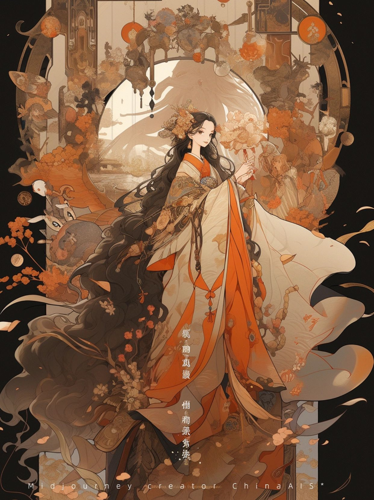 Midjourney+niji咒语:the film poster for the japanese film, in the style of traditional animation, light gold and orange, full body, i can't believe how beautiful this is, colorful costumes, abigail larson, mosaic-like --ar 3:4