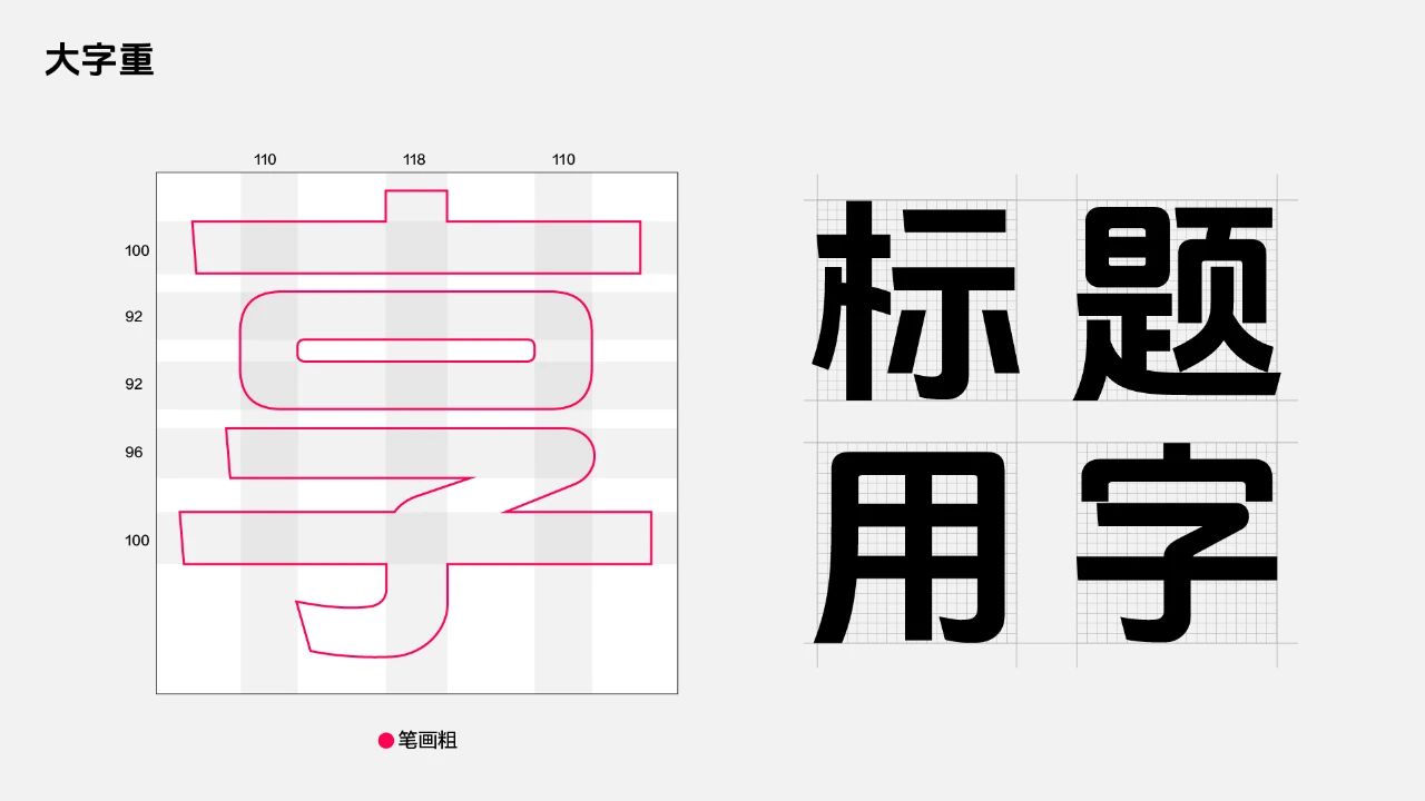 为构建品牌字体的独特性,抖音美好体的笔画细节采用了非常规的圆弧设计和倒角设计。弯勾笔画采用大曲率圆弧曲线,均匀顺滑的线条设计使得字体更流畅优美,更具视觉韧性。折笔笔画则在平衡字体易读性和识别度的基础上,采用了内直外弧的倒角方式,传递出一种“刚柔并济”的人文气息。