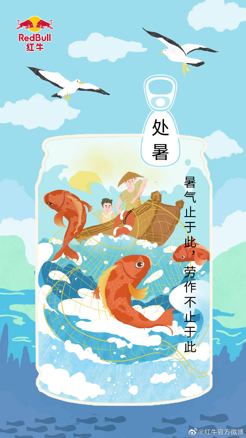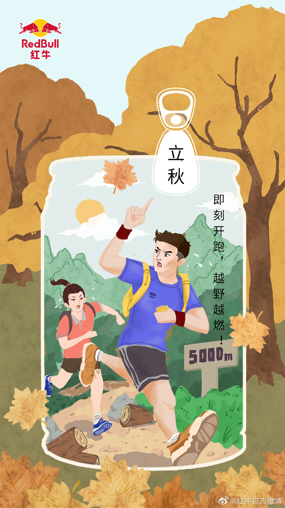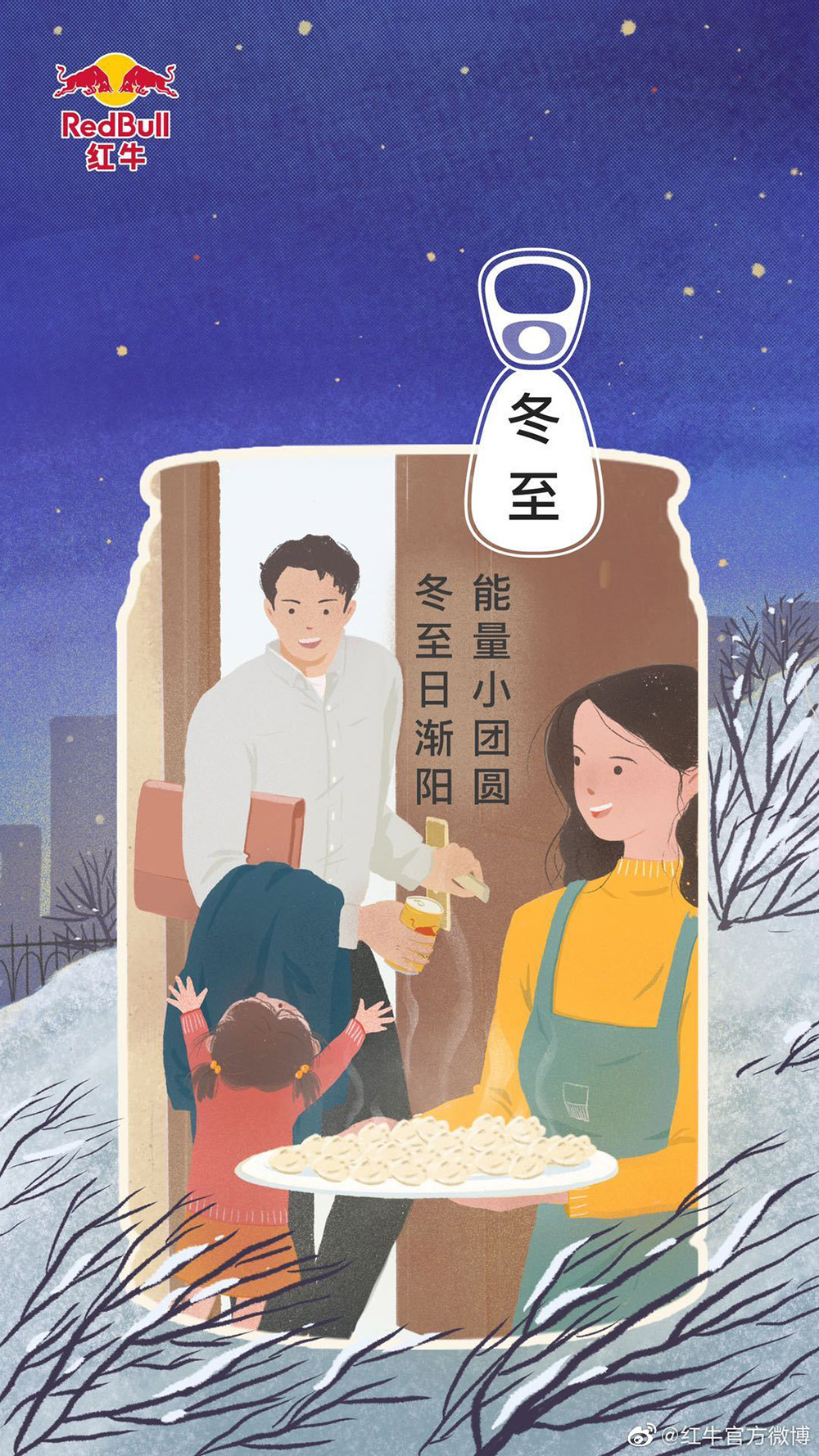 一组红牛的插画节气海报,将红牛包装的外轮廓作为贯穿整一年节气海报的特点,将插图的主要内容画在形状中,使海报的主题突出、整体性增强。