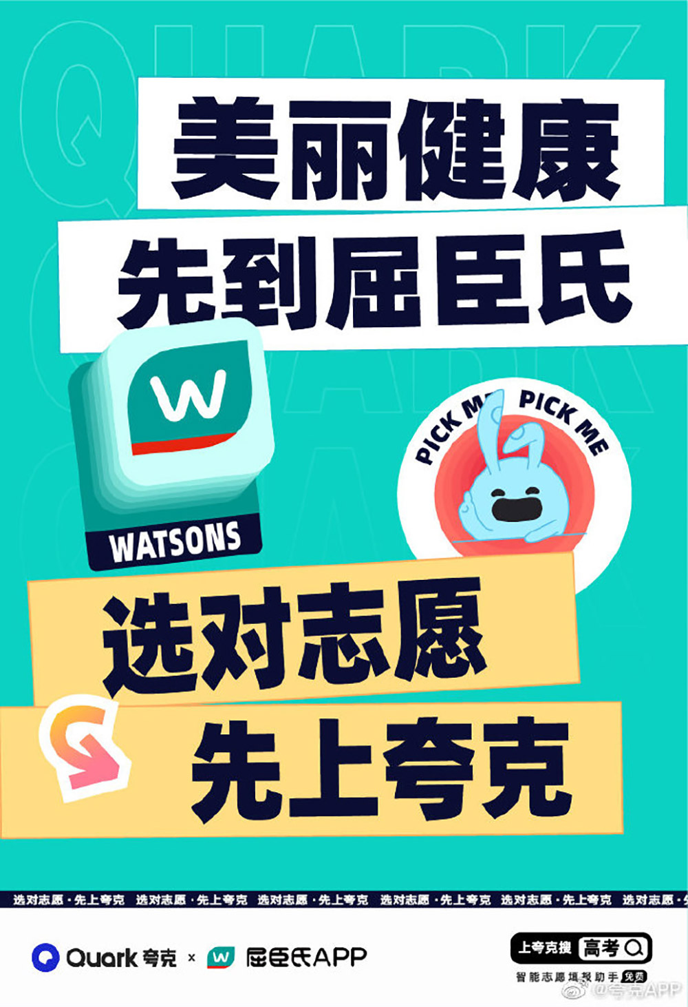 12张夸克营销海报设计,通过提取联合品牌、平台、主题的色彩只作为背景主体色,加入简洁干净的文字内容排版,设计出来的海报也不失美感~