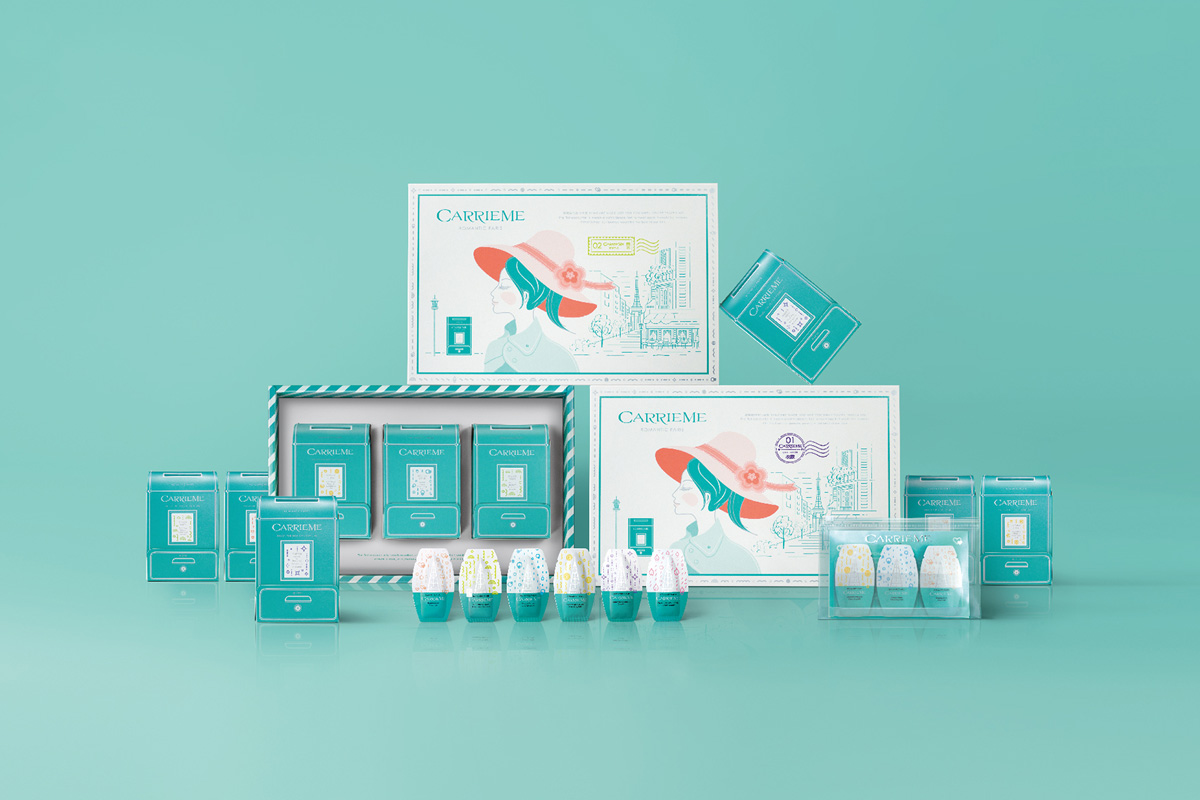 以旅行概念为品牌诉求,借由凯丽米女孩形象气氛与情绪转换表现产品的功能与故事性。此系列以巴黎为背景故事,从旅行中所产生的心情与期待而命名,因此所产生的情绪去设计6种不同的视觉符号结合马卡龙色系、巴黎雨都印象、埃菲尔铁塔呈现法国浪漫及区分产品功效,营造清新脱俗的轻活感。幸福时光礼盒,延续品牌定位“旅行“。运用旅行记忆的味道为概念,让每一趟旅行中所使用的产品成为独特的记忆,由香氛纪录旅程的回忆。巧妙的运用邮筒的特性,将旅行保养随身包与明信片的概念融为一体,从旅行保养机能盒下方抽取旅行保养随身包,将这份旅行的记忆涂抹在肌肤上,将未使用完的随身包插在邮筒上方,让随身包与邮筒巧妙结合,解决随身包无法放置的问题,最后以凯丽米形象女孩借由明信片传递一份女孩期待旅行的心情,将旅行与明信片及邮筒三者关系紧密结合在一起与消费者形成互动。