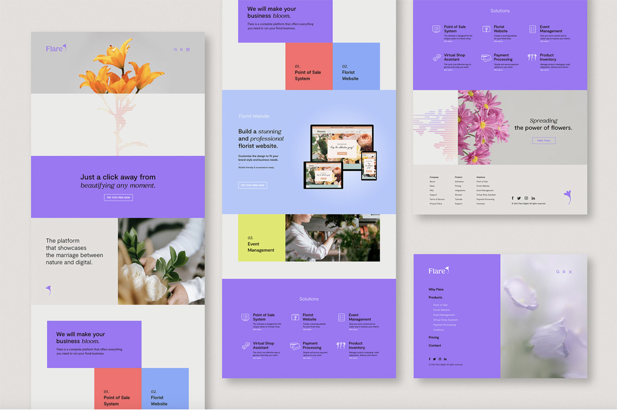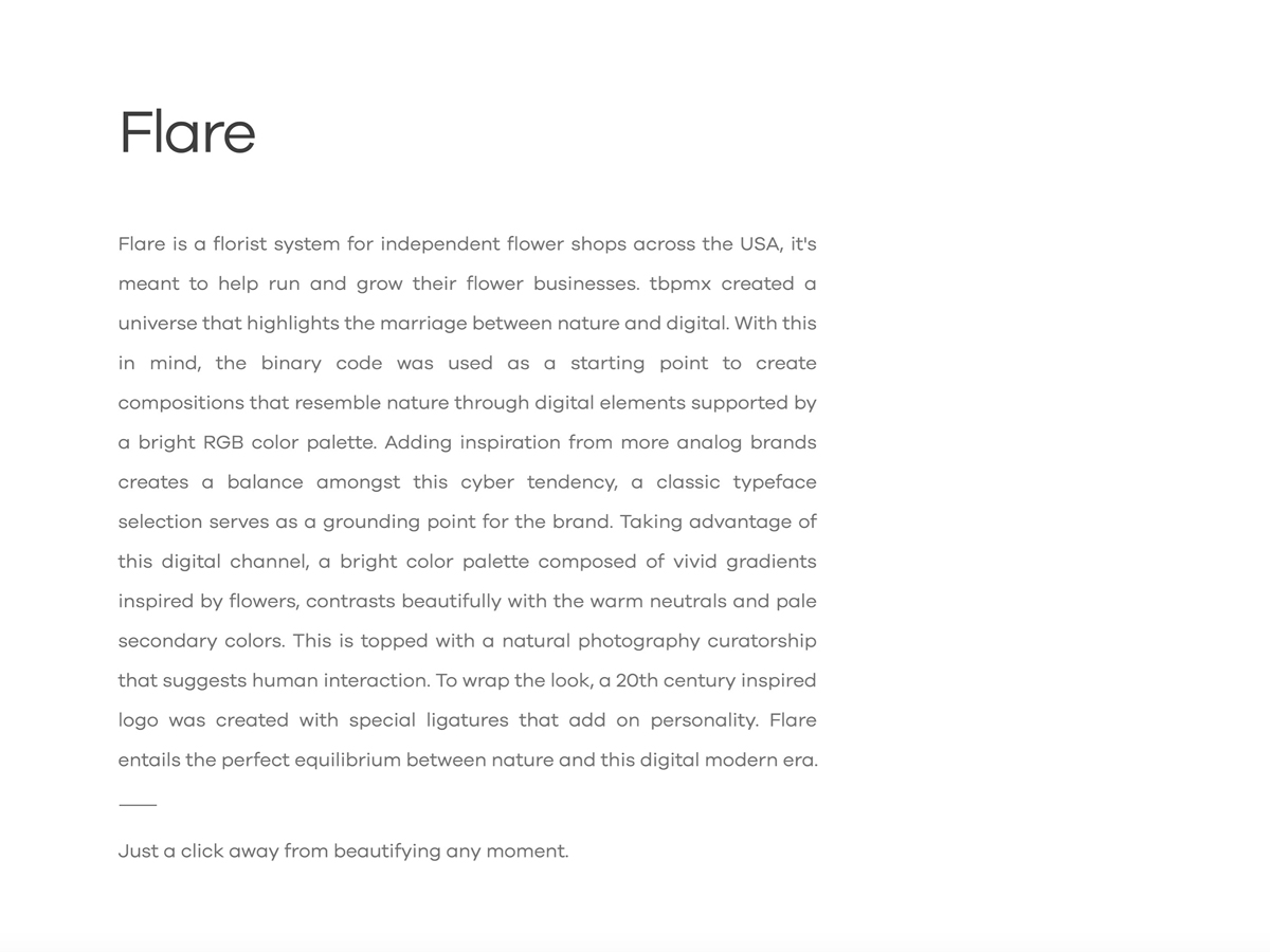 Flare是一个独立花店系统,旨在帮助经营和发展花店业务。品牌视觉将自然与数字相结合,采用二进制代码的元素,通过明亮的色调和植物的构图,将鲜花与模拟世界相结合。