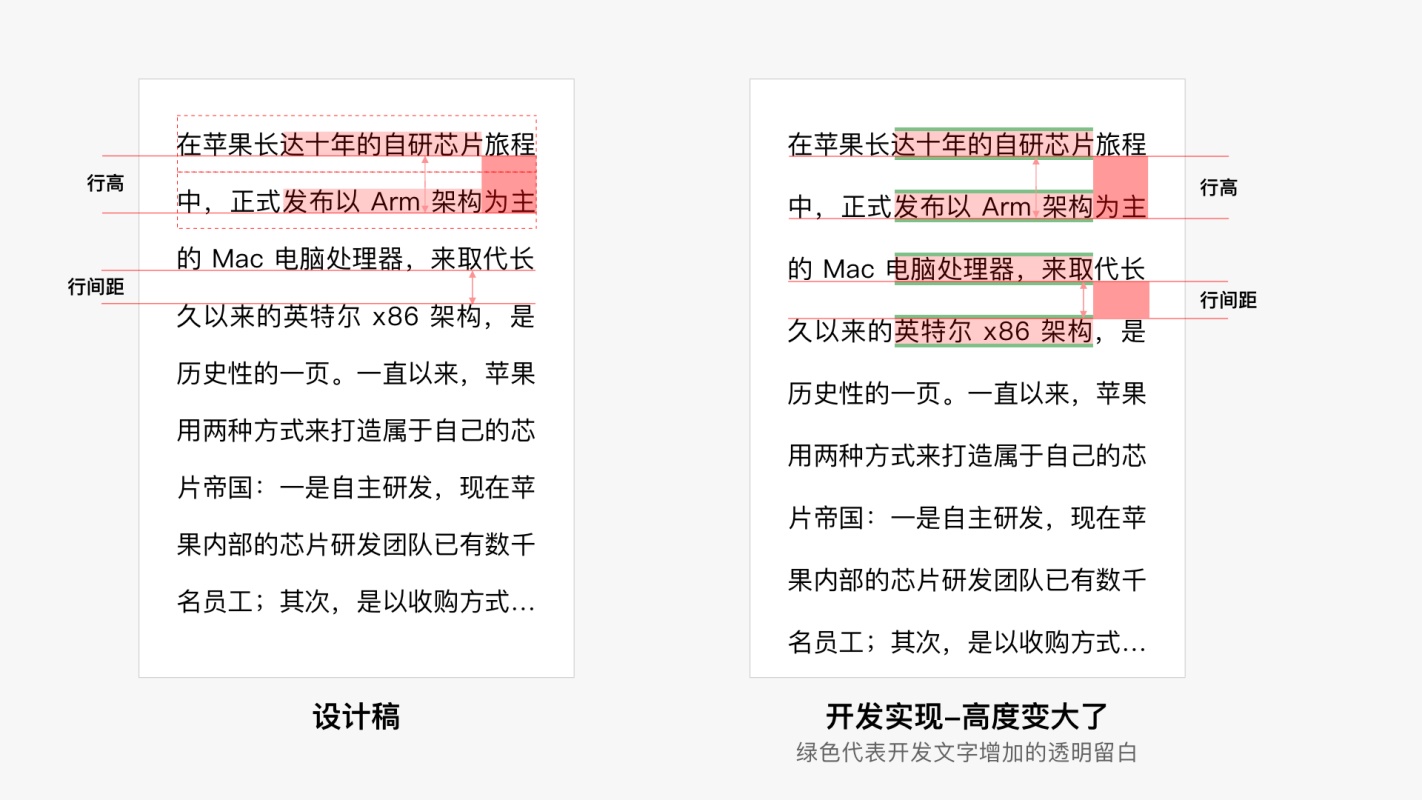 设计师提供的设计稿与开发出来的文字高度有所不同比如,实际开发出来的会更高一些;iOS 设备与Android 设备也有所不同,比如可以看到同样是显示20号的字体,安卓的行高会偏高一些。在不同的 Android 设备上使用的字体不一样,可能还会出现更多的差别。如果不想办法抹平这差别,就不能真正意义上实现双端一致了。