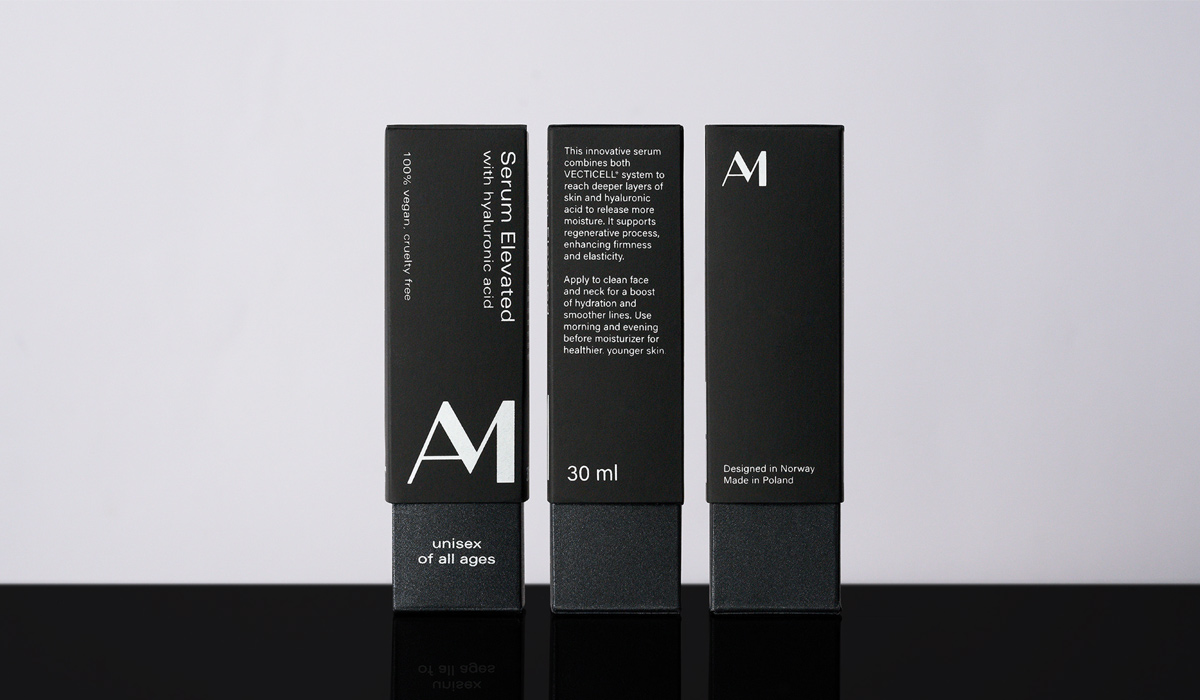 AM Serum Elevated 是一款护肤品,它结合了vecticell系统和透明质酸,可深入皮肤深层,释放更多水分。包装通过Majestic和Sirio Pearl两种不同质地的黑色纸张组成,整体视觉简约大方,又细节丰富。