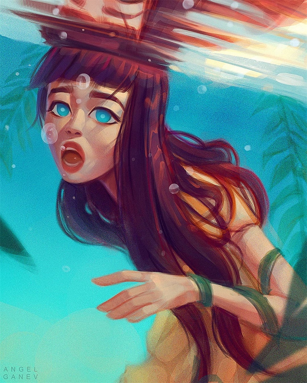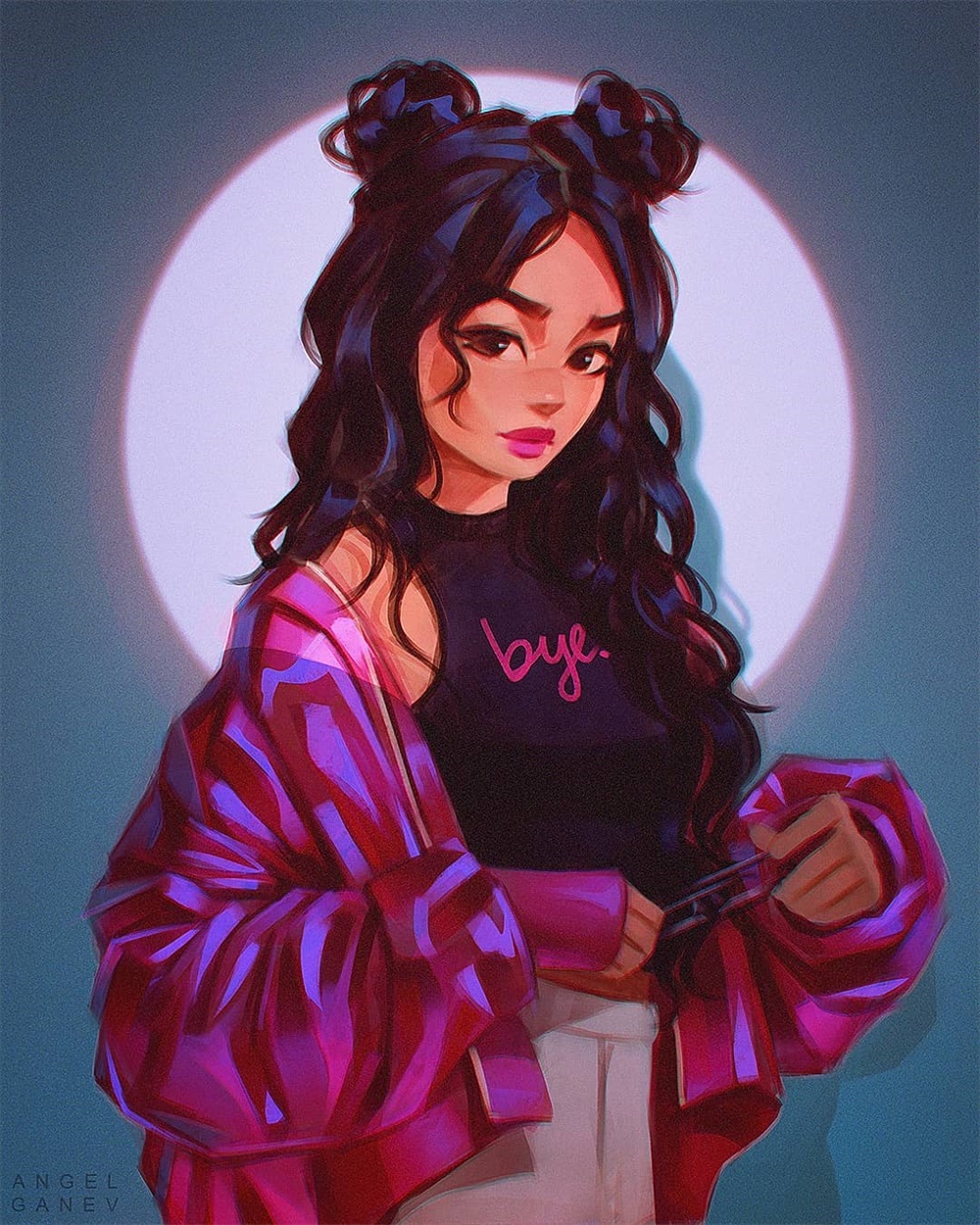 插画师 angelganev 人物绘画作品,画面中人物表情丰富,孤独但内心情感丰富给予了作品生命,再加上噪点肌理点缀,使画面丰富既耐看。