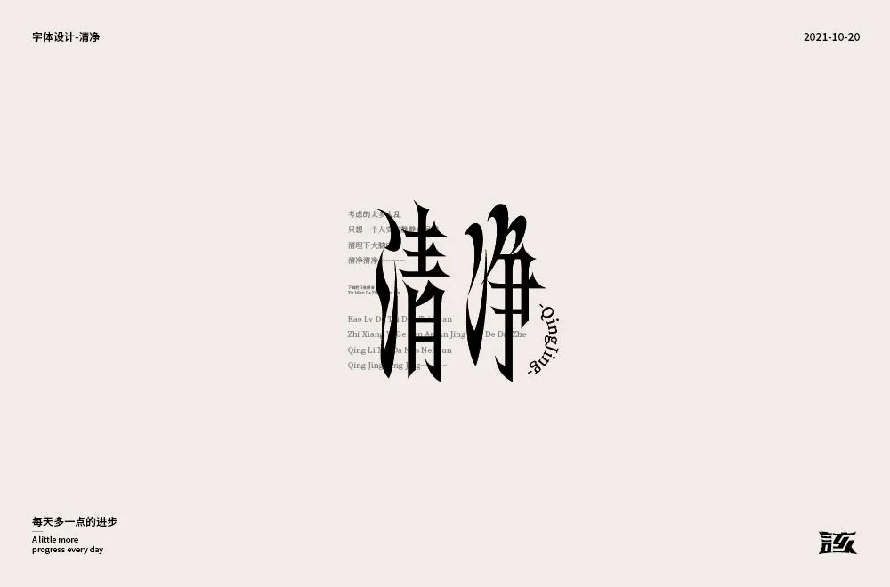 清净——命题字体设计。这组上榜的作品,都是字形或创意较为突出的作品,某些作品可能还不甚完美,但都有学习和借鉴的价值,愿这些作品能给你带来灵感和启迪。