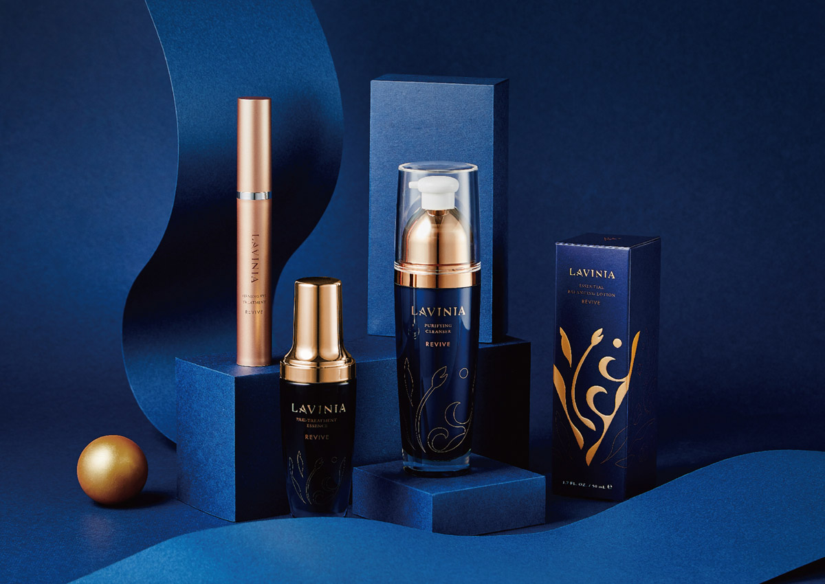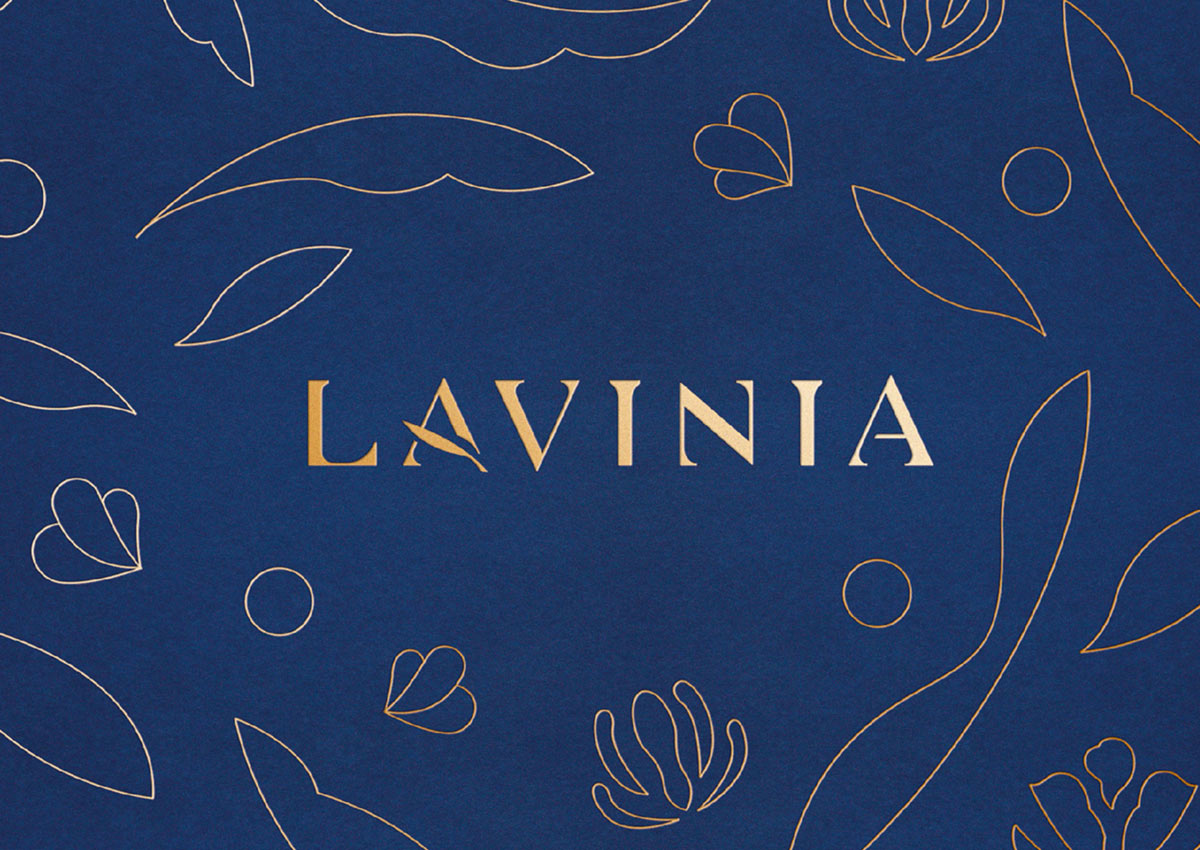 LAVINIA 是以自然植萃与生医专业为根基,专注研发天然肌肤护理产品的品牌。LAVINIA 品牌名称来自于希腊罗马神话美丽公主,以“高贵优雅”与“智慧坚毅”为品牌精神,也带有“纯净”的意涵,象征着柔美的女性也有着坚毅纯洁之意。“ LAVINIA”品牌识别设计,是以英文字母的首位字母“A”为主要结构,结合了向上生长的天然植萃,有着青春光彩与活力绽放及专业自信的品牌内涵,并代表“LAVINIA”的向上发展与进军国际的企图心。设计师同时加入“V”辅助元素与色彩,使得构图形成“植萃生机”的抽象视觉,不仅呈现出品牌蓬勃发展的生命力,也以“植物”与“字母”交互生长,表现出“LAVINIA”人与人之间的交流与紧密性。而以金色及深蓝底色为色彩,既有融合专业与美丽的意涵,彰显出“LAVINIA”在保养的专业上发展出丰饶的成果,更有强化品牌精神,塑造独特的视觉形象。