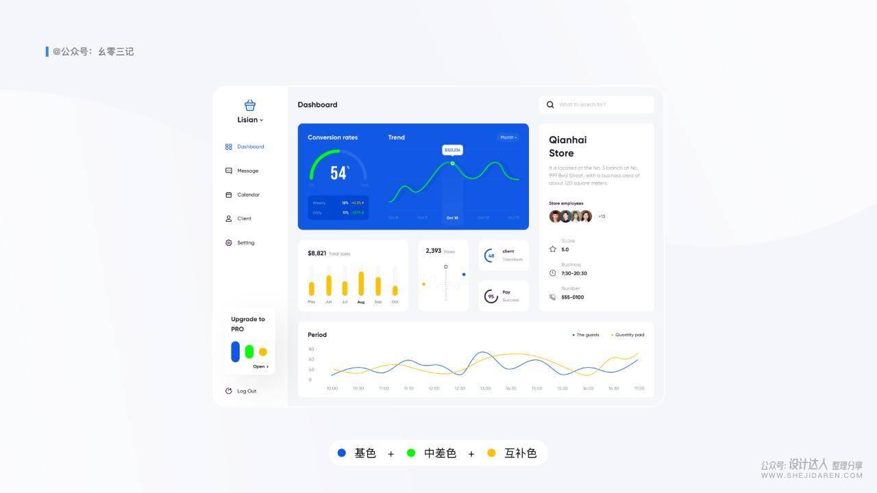 看完案例后可以发现,界面的配色确确可以影响到我们对这个作品的视觉感受,所以在界面设计后可以更具你定义的这个产品特质:比如咖啡类产品基本主色固定使用咖啡色、或行业特性:金融产品基本使用蓝色、又或是你希望传递出一些不一样的感受还可大胆创新。