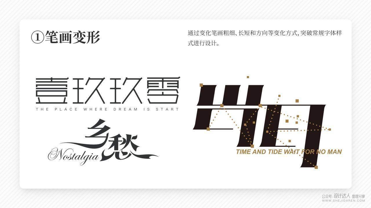 字体设计表现手法包含:圆方三角,结构化场景,水墨风,笔画重复,变化笔形,连笔断笔,改变重心,笔画省略,移花接木等等。