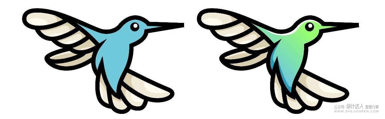接下来我们从图片中吸取一些颜色用来给蜂鸟内部填充上颜色,有些颜色需要主观去调整,比如绿色,在这张图里很难吸到视觉所看到的色彩,选择一个中间色调来填充翅膀部分,下方的翅膀填充稍暗的颜色,整体的描边根据视觉效果适当加粗。
