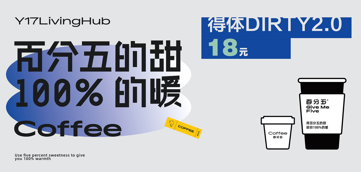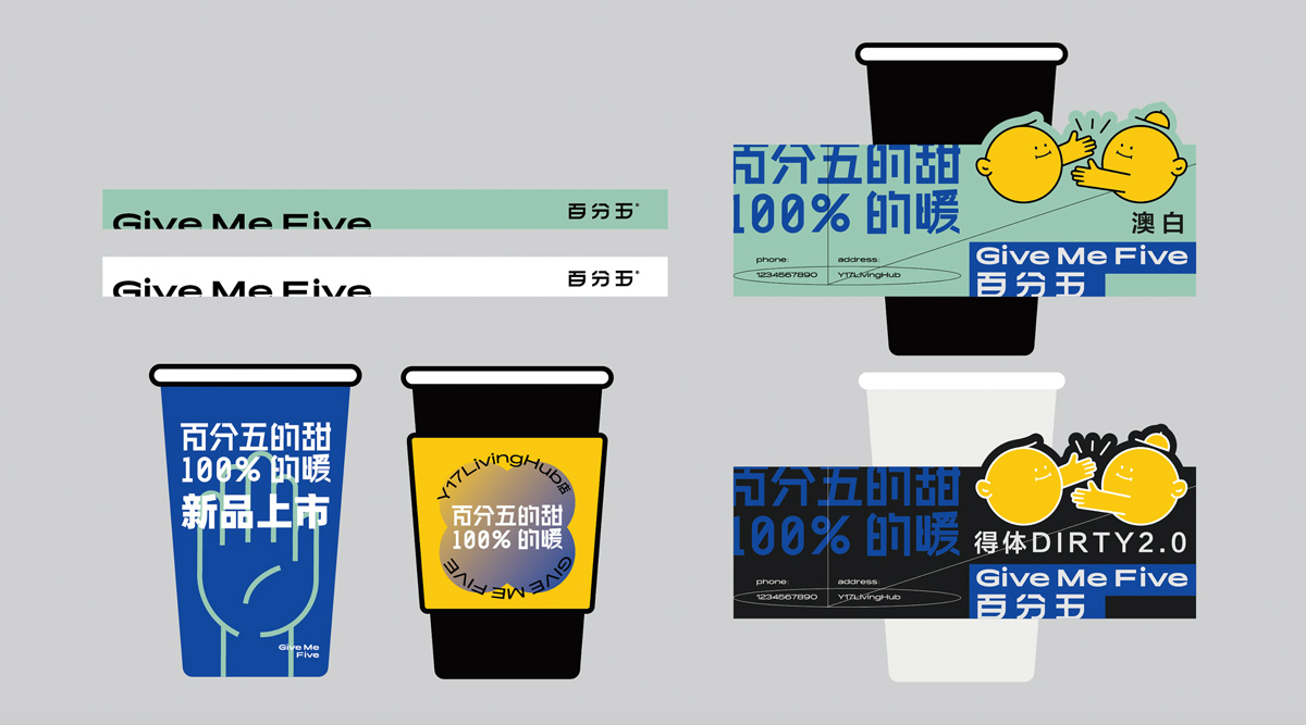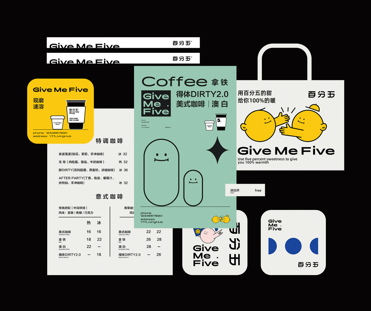 百分五咖啡是郑州本土的品牌,在此之前做咖啡和烘焙,现在抛弃烘焙只做咖啡,所以需要一个全新的品牌形象设计,创始人希望做与行业不同的设计,中文保留英文变更为:give me five,最初提成从5与%符号展开艺术化处理,因为Arabica咖啡在业内的统治力,对此方向有异议,经沟通有了现在品牌的视觉,运用年轻有趣的形式打造品牌的超级符号,加上丰富多变的延展,符合当下审美需求。