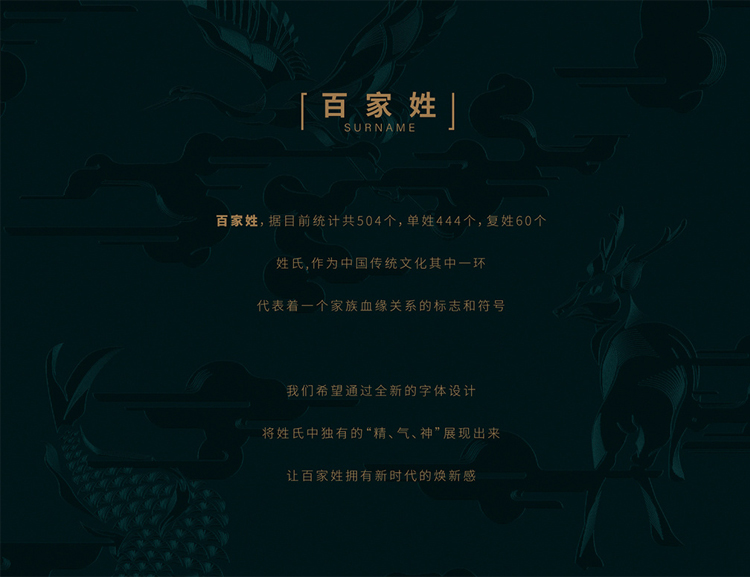 姓氏的礼,以姓氏汉字为文化根源,通过不同的载体,衍生不同类型的礼品,赠送礼物,代表着尊敬、祝愿等美好的祝福,相互馈赠礼物,已经是社交生活中常见的礼节。百家姓,据目前统计共504个,单姓444个,复姓60个。姓氏,作为中国传统文化其中一环,代表着一个家族血缘关系的标志和符号。我们希望通过全新的字体社交,将姓氏中独有的“精、气、神”展现出来,让百家姓拥有新时代的焕新感。