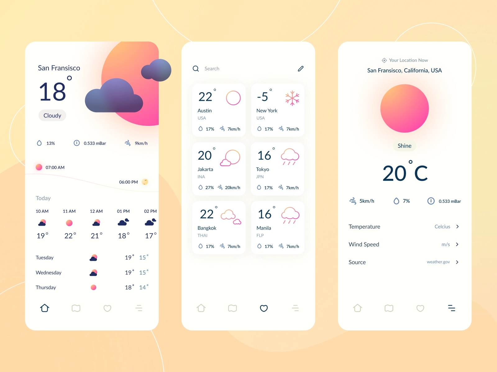 人的心情是会被天气所影响的,在早上要是看到今天是晴天,那我会很开心,可以去做很多休闲的事情。所以让用户感知到天气的情绪也是天气APP所必须的一项传达。而这12个天气界面可以让你的灵感绵绵不绝。