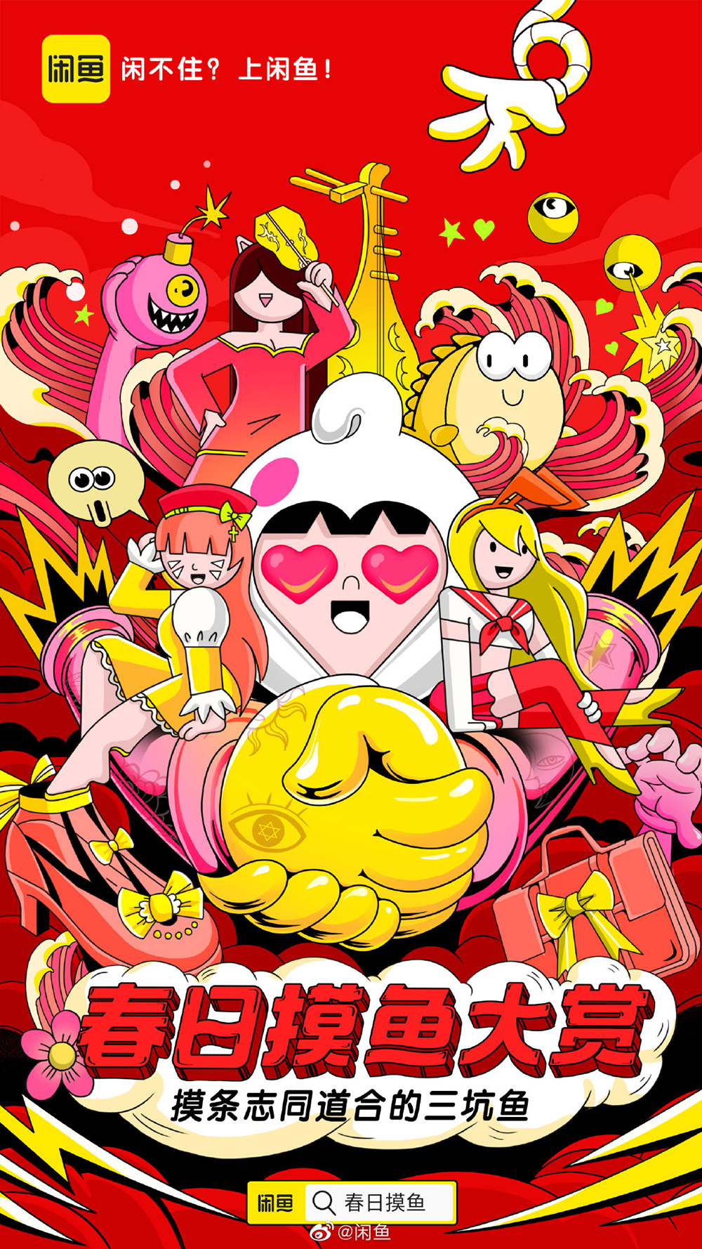 一组闲鱼「春日摸鱼大赏」插画海报,高饱和度的色彩搭配,强烈的色彩之间的碰撞,在眼前爆炸开来,感染力超强,非常值得学习。